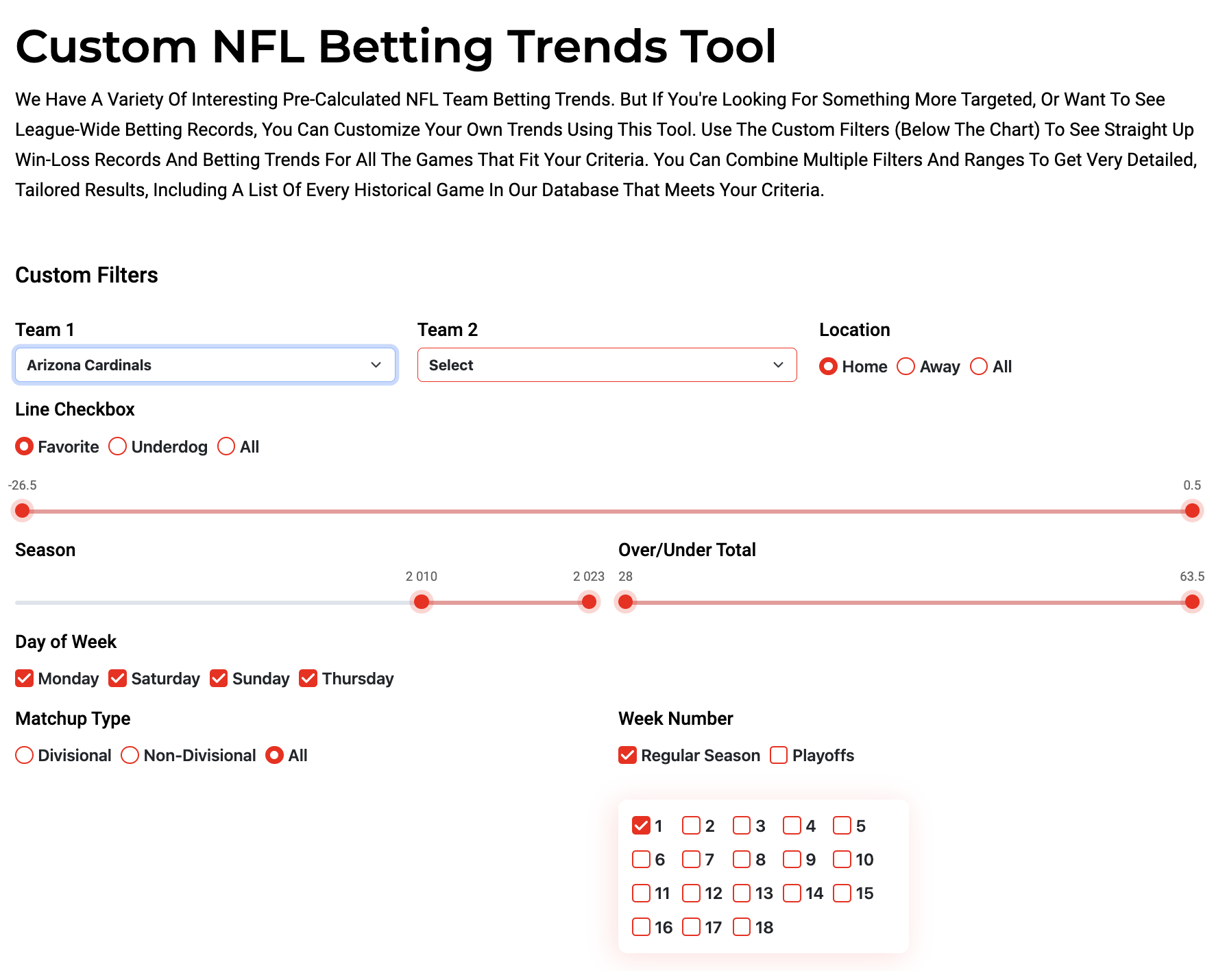Trends Against The Spread allows users to custom build and analyze NFL betting trends with 40+years of historical NFL data. Our model is user-friendly and provides an expansive array of trends to select from